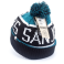 Трикотажная шапка крупной вязки с отворотом и цветным помпоном. Вязаная надпись названия команды по окружности шапки. Вышивка с символикой San Jose Sharks спереди.